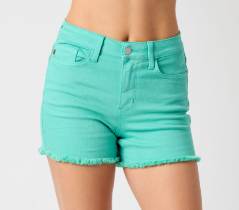 Judy Blue Denim Mid-Rise Aquamarine Frayed Hem Shorts