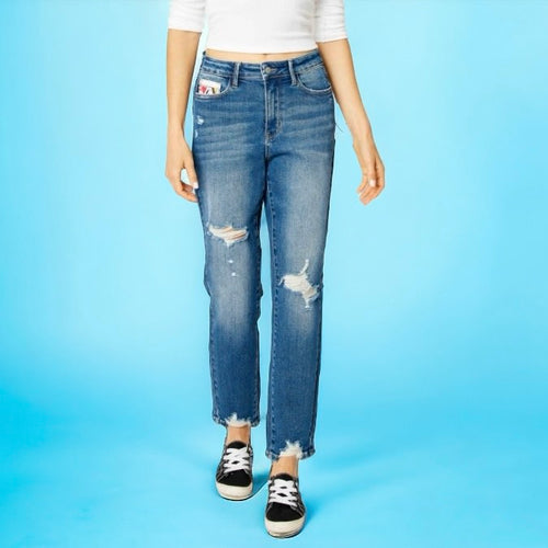 Judy Blue Queen of Hearts Coin Pocket High Waisted Distressed Slim Boyfriend Jeans