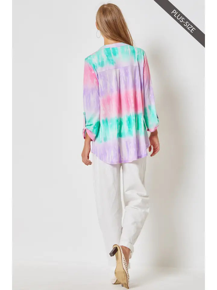 Our signature Lizzy top features poly blend which features luxurious softness with lightweight, wrinkle free comfort. This easy care fabric top is travel friendly, cooler than linen and other materials which makes your perfect ON THE GO wear. Lizzy top also features China collar neckline with 3/4" length sleeves with tab details. The fit is relaxed, flowy fit with slight high low.