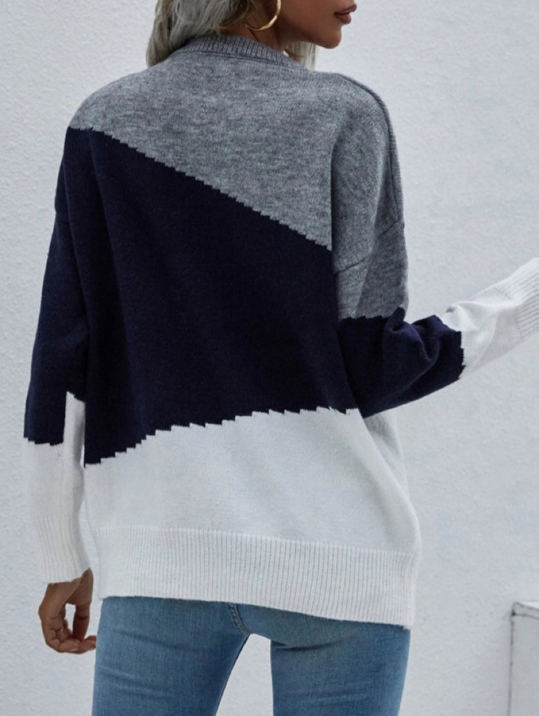 Round-Neck Striped Contrasting Knit Sweater – Navy, White & Gray