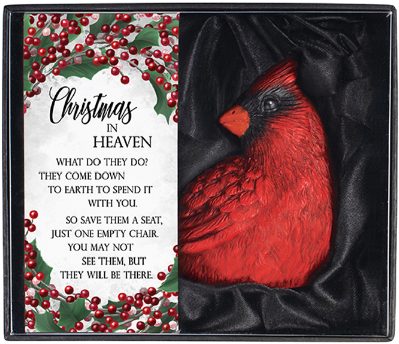 Our gift boxed cardinals are made of hand-painted resin. Each gift box comes complete with a sentiment card and velvet lining for protection. The cardinal measures 3"H x 3.5"W x 2"D and the gift box measures 4.25"H x 5.25"W x 2.25"D