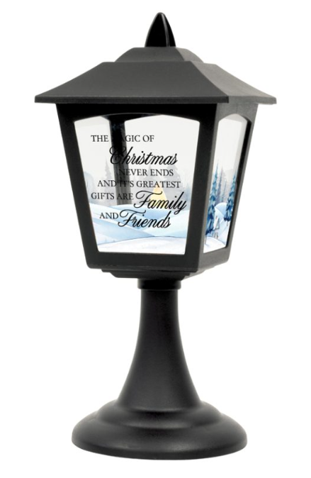 These lanterns are made a high quality metal finish and uv printed glass artwork with sentiment and comes with a fabric shade. DC 3V Lightbulb is included. On/off switch and requires 3 AAA batteries (not included.) Indoor use only